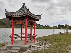 Beside Ross Lake is the Chinese Miners' Memorial Garden, created over a two-year period by the Ross volunteer group Westland Regional Environment Incorporated Society (WRENIS) led by Biddy Manera, at a cost of $180,000.[8] It includes a Chinese pavilion (liang ting) and ornamental tree planting.[21] In winter 2020 a slip in Jones Creek blocked the outlet of the lake, and the pavilion was flooded and thousands of dollars worth of trees and shrubs were killed.[8] Fully repairing the lake outlet would require a resource consent, so in the meantime WRENIS volunteers dug a small channel by hand to divert some of the flow of Jones Creek to a culvert, allowing lake levels to stabilise; work done by hand did not require a consent.[8] Their work was repeatedly vandalised, however, for months and on an almost daily basis, causing the lake to rise and drown the gardens again.[21] The Westland Regional Council, which manages waterways, was called in to support WRENIS's efforts.[22] After two rounds of public consultation involving the Department of Conservation, the Westland District Council, and the Ross Community society, all parties agreed in March 2021 to lower the lake levels and prevent future flooding, with the District Council covering the cost of the resource consent.[23]