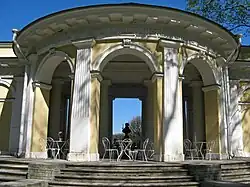 The pavilion formed part of the general reconstruction of the garden and its surrounding areas, begun in 1817 under the orders of Emperor Alexander I. The centrepiece was to be a new palace complex for his younger brother, Grand Duke Michael Pavlovich. The palace was designed by Rossi, while the plans for the garden were drawn up by Rossi and Adam Menelaws, and approved by the emperor in April 1822.[5][7] The garden plans followed the style and techniques of English landscape gardens, which had become internationally popular in the eighteenth century.[7] The existing ponds were reshaped into more natural meandering outlines and picturesque groups of trees supplemented the plantings along the pathways. The pavilion and its pier, designed by Rossi and completed in 1825, formed part of this ensemble, and was intended "for romantic meetings on summer evenings over a cup of tea or playing cards".[5][7] Rossi himself designed the railings for the pier, which were cast by the Aleksandrovsky Iron Foundry.[5] A surviving description of the two rooms of the pavilion records that in one "the ceiling is painted with lemon-coloured figures and arabesques. The arches above the door, windows and mirrors are painted stucco work ... The walls are painted yellow ... The furniture is mahogany ... the upholstery of blue calico with yellow flowers." In the other, the walls are green, "the ceiling is painted with green figures and arabesques, the mahogany furniture is covered with green chintz with yellow flowers."[5]