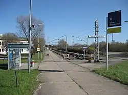 In the following years, the network was slowly but steadily expanded and the result was one of the largest railway yards in East Germany, with 240 kilometres of track in 1987. The connecting curve towards Bentwisch was opened in 1963. On 31 May 1964, a direct link was opened towards Kavelstorf on the line to Berlin, which had reopened a few years before.[4] The construction of the line was difficult because of topographical conditions. The embankment rose to a height of up to 24 metres above ground level[5] and 1.5 million cubic metres of earth and about 150,000 cubic metres of peat were moved.[6]