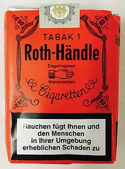 Roth-Händle was launched in 1897 and has been registered since July 22, 1897, in the German register of trade marks.[2] "Roth-Händle" cigarettes were referred to colloquially as "Lung torpedo", "Lung suppository", "Toth-Händle" or "Red death" due to its former strength. Today, it is forbidden to sell cigarettes in the European Union with an amount of tar, nicotine and carbon monoxide that is higher than 10 (tar), 1.0 (nicotine) or 10 (carbon monoxide) milligrams.