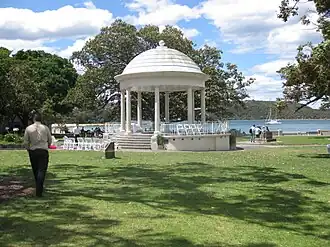 The Rotunda is located in Balmoral Beach Reserve at Balmoral Beach, Sydney. It was built in 1930 as part of the beach improvement program undertaken by Mosman Council.[1] Overlooking the bay and close to Rocky Point Island, it is set in a very picturesque area. After its completion it was a very popular venue for brass band concerts for many years throughout the 1930s and 1940s. Today it is used for festivals, events and weddings and is an important historical landmark in Balmoral.