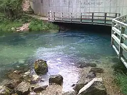Roubidoux Spring is a second magnitude freshwater spring located within the city limits of Waynesville in the Missouri Ozarks. The spring discharges from the base of a rock ledge that has been capped by a large concrete wall, built to hold the road that passes over the spring. Spring water flows a very short distance before adding its waters to the Roubidoux Creek. A city park with trails and a board walk has been developed around the spring. This spring is noted as having an average discharge of 58.3 ft³/s.[1] However, due to very limited discharge data, an accurate description of the flow of this particular spring may be difficult to find. This could be a first magnitude spring – over 100 ft³/s. According to some lists, this ranks as the 15th largest spring in the state[2]. The area near this spring has very intense karst topography, many caves, springs and large sink holes are present within a few miles of this spring.