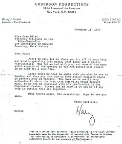 Wales received personal permission from Leonard Bernstein to give the UK Premiere of his Bernstein Mass in Coventry Theatre on 16 May[16] and the Royal Albert Hall on 17 May 1976. Performers included the City of Birmingham Symphony Orchestra, London Chorale, Cycles Dance Company, The London Chorale and University of Warwick Chorus.[17][18][19][20]