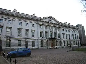 The long façade of the three-storey rectangular stone building has windows with Doric order running through the first and second floors. Above is a broad central pediment which displays the royal coat of arms engraved in stone with six columns below. The end bays are decorated with four pilasters.[96] Due to its historic significance, the building became Grade II* listed on 27 September 1973.[97]