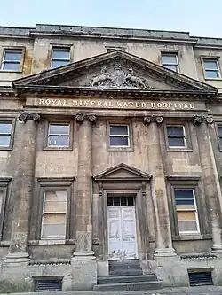 The hospital was established in 1738 as The Mineral Water Hospital.[3] It provided care for the impoverished sick who were attracted to Bath because of the supposed healing properties of the mineral water from the spa. The original building, designed by John Wood the Elder, was built with Bath stone donated by Ralph Allen and completed in 1742.[3] It was enlarged in 1793 by the addition of an attic storey, and in 1860 by a second building erected on the west side of the earlier edifice.[3][4] A fine pediment, in Bath stone, on the 1860 building depicts the parable of the Good Samaritan.[3] The building was classified as Grade II* listed in 1972.[3]