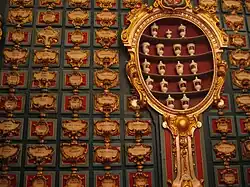 These rooms were formerly occupied by Infante Luis, Count of Chinchón before his exile. The Stradivarius Room now contains a viola, two violoncello, and two violins by Stradivari. The ceiling fresco by A. G. Velazquez, depicts Gentleness accompanied by the Four Cardinal Virtues.[42]