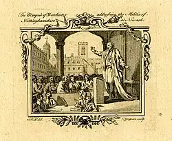 Nottinghamshire was given a quota of 480 men to raise,[45] but failed to do so, partly because the Lord Lieutenant, Thomas Pelham-Holles, 1st Duke of Newcastle, was opposed to the militia, and his Pelham family members were powerful in the county. There was also widespread anti-militia feeling in the county, with intimidation of parish constables, many of whose ballot lists were seized by rioters before they reached the lieutenancy meeting at Mansfield on 5 September 1757. A mob armed with clubs then invaded the meeting and destroyed the remaining lists. Many of the protesters in Nottinghamshire feared being forced into overseas service if they were selected by lot: some said that they would rather be hanged in England than scalped in America. There was also religious opposition to any form of census. Even when the riots were quelled and other counties' militia had been called out in the invasion crisis of 1759, the Nottinghamshire county gentry were apathetic, preferring to pay a large fine instead of raising their regiment.[46][47][48]