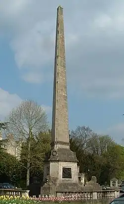 Inside the east entrance to the park on Marlborough Lane is the Grade II* listed Victoria Column, erected in 1837 to mark the coming-of-age (at age 18) of Princess Victoria. G. P. Manners, the Bath city architect, designed a tapering triangular stone obelisk, about 33 feet (10 m) tall. The triangular plinth has a low-profile relief of the Princess, and contemporary and later inscriptions on its other faces; radiating from it are three plinths bearing lions couchant. The whole is surrounded by a low balustraded wall. The unveiling of the monument took place on Victoria's coronation day, 28 June 1838.[4]