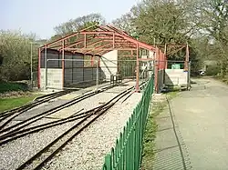 The ride normally starts at Piccadilly, named after the park road junction just opposite. Tickets are bought from the engine shed, opposite a well laid out yard, which is in fact the area for a new station building. The carriage shed is also here. Upon leaving the station, which is set into the hillside the line curves, crosses a set of points, that lead up to the yard and hence the engine shed, and runs along a straight parallel with Southampton water. The view from here is obscured by gorse hedges. At the end of the straight is another point, put in place for the new extension being built. The train will always curve left here and run inland. On the left, a new double track section can be seen. leading back to the yard and the site of a new terminus station through the carriage shed.