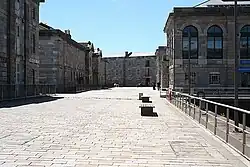 The Royal William Victualling Yard is arranged around a deep basin lined with granite (designed to accommodate half a dozen 'transports' or merchant vessels).[2] This basin provided the main point of access from the sea, although a double set of steps rising from a landing-stage below the Clarence Building provided a fitting entrance for dignitaries arriving by boat. A tunnel entrance was also provided, giving access from Firestone Bay (on the opposite side of the promontory), where boats could be landed in the event of vessels being prevented (e.g. by a strong tide or adverse weather) from reaching the basin.[2] The main access from land was (and is) through a grand gateway at the end of Cremyll Street, a high wall having been built around the landward portion of the site for its security. A reservoir to the south provided the Yard with an independent supply of fresh water.[7]