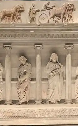 I #1 (Mourning women) Hellenic style sarcophagus, shaped like an Ionic temple and made of Pentelic marble with polychrome reliefs.[66] The trough stands on a 0.4 m (1.3 ft) pedestal consisting, from bottom to top, of a flat band, a row of egg-and-dart motifs framing an intricate relief depicting a hunting scene, a molding and a final flat band that serves as a plinth. On top of the plinth, a row of 14 Ionic columns and four pilasters enshrine 18 female figures in mourning.[67] The columns are surmounted by an architrave. The trough measures 2.68 m × 1.38 m (8.8 ft × 4.5 ft) and 1.29 m (4.2 ft) high.[67]