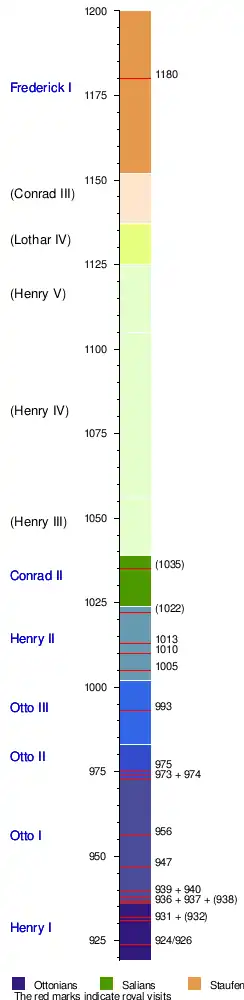 Under the Ottonians Werla experienced its first golden age,[9] as shown by documents recording fourteen royal visits between 924 and 1013. All Ottonians visited the palace at least once; Otto the Great is recorded at Werla on five separate occasions. The visit of the Salian Conrad II in 1035 during a meeting of the Imperial Diet is doubtful, however. At least twice the royal succession was decided at the Palace. Thus, during the succession crisis in 1002, the Bavarian duke Henry IV was accepted at Werla as successor to Otto III, who had died without children. The chronicle of Thietmar of Merseburg reports he had provoked an uproar when he wasted the time reserved for an audience with visiting Abbesses. Even before the election of Conrad II in 1024, the Saxons had held discussions at Werla.[10] In total, four meetings of Saxon nobles are known; this is not evidence for a regularly occurring Landtag, however. During the palatial period, the ring walls and the most important public buildings within the main fortress were built. To the north an original bailey developed, which at first covered only three hectares, however.