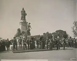 The Canadian portion of the 1901 royal tour began 16 September 1901, when the RMS Ophir arrived in Quebec City.[76] The royal party – which consisted of 22 people, landed at Quebec City on 16 September. During his time in Quebec City, Prince George invested Lieutenant Richard Turner with the Victoria Cross for his conduct during the Battle of Leliefontein in a ceremony at the Plains of Abraham, and spoke to students at the Université Laval.[80] Moving west of Quebec City by railway, the group made stops to Montreal, and Ottawa.[81] Throughout the royal tour, Prince George placed an emphasis on praising the creation and expansion of the country during his own lifetime, giving a speech about the country's development and growth in Ottawa and Winnipeg.[82]