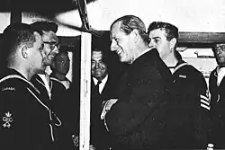 One of the most important events of this trip was the official opening of the St. Lawrence Seaway, along with President Dwight D. Eisenhower, where, in Prescott, Ontario, the Queen made her first live appearance on Canadian television.[130] During this tour, the Queen paid numerous visits to Canadian industries,[131] and again made a visit to the United States as Canada's head of state, stopping in Chicago and Washington, D.C., with Diefenbaker as her attending minister. The Prime Minister insisted that the Queen be accompanied at all times by a Canadian Cabinet minister, being determined to make it clear to Americans that the Queen was visiting the United States as the Canadian monarch, and that "it is the Canadian embassy and not the British Embassy officials who are in charge" of the Queen's itinerary.[132] Her speeches in Chicago, written by her Canadian ministers, stressed steadily the fact that she had come to call as Queen of Canada.[133] In this vein, the Queen hosted the return dinner for Eisenhower at the Canadian Embassy in Washington.[127]