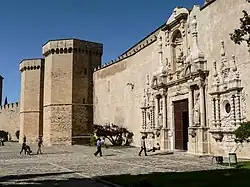 Facade of the Abbey Church (and to its right the Royal Gate) of the Poblet Abbey. It was attacked and devastated by peasants from neighboring towns who cut down forests and desecrated graves due to the "cry of the flattering voices of freedom and equality", according to the abbot himself.