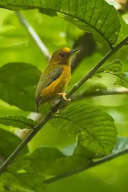 The rufous piculet is a very small bird with short wings and an almost non-existent tail, ranging in length from 8 to 10 cm (3 to 4 in). The upper parts are generally green tinted with bronze, and the underparts rufous, orange or cinnamon, with paler flanks. The mantle and back are olive, the wings are brownish above, and the underwings are buff. The stumpy tail is blackish above, edged with olive. The sexes are different; the male has a yellow or golden patch on the forehead whereas the female has a bronze patch. They also differ in that the female has a larger beak. The upper mandible in both sexes is blackish and the lower mandible yellowish. The iris is reddish and there is a pinkish or purplish ring of bare skin around the eye.[4] The legs and feet are yellowish or orange, and this piculet has just three toes on each foot,[5] (four being normal in the woodpecker family).[6] The juvenile is rather more grey.[4]