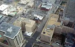 Aerial view of Rufus M. Rose House. The house is almost in the center of the photo with blue tarps hanging off its roof - just down and to the left of the orange taxi. Emory University Hospital Midtown is to the right. Photo taken from Bank of America Plaza.