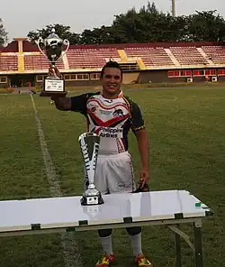 Captain of the winning Philippines team, Luke Srama holding the trophy at the inaugural Asian Cup in 2012.