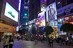 Russell Street is an east–west running street with two sections. It starts from Lee Garden Road, split by Matheson Street and Percival Street, and ends in Canal Road East. Russell Street is one of the most crowded streets in Hong Kong. The eastern section from (Lee Garden Road to Percival Street) was renovated and reopened as a full-time pedestrian street on 7 April 2000.[2] It was the first pedestrian street in Hong Kong. The remaining section, from Matheson Street to Canal Road East, was also added to the scheme as a traffic-calming street later.[3] Nearby are Times Square, a video wall, an MTR station, a cinema, many famous shops, taxi station.