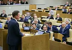 South Korean president Moon Jae-in paid a state visit to Russia in 2018. On June 21, he addressed the State Duma, the lower house of the Russian Federal Assembly. He became the first South Korean leader to speak in the Russian Parliament.[11] On June 22, Russian President Vladimir Putin held talks with Moon Jae-in in Moscow. Leaders signed a document for foundation of free trade area.[12]