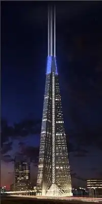 The total area of the structure would have covered 520,000 m2 (5,600,000 sq ft), of which approximately 200,000 m2 (2,200,000 sq ft) would have been underground. The tower would have contained 118 floors, 101 elevators, and 3,680 underground parking spaces. Commercial retail shops would have been located at the base of the building. The maximum capacity of the building was projected to be around 30,000 people.