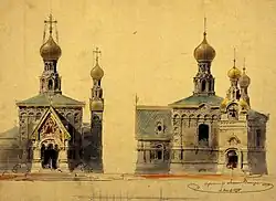 The Russian revival style church with gold Onion domes was built between 1897 and 1899 by the architect Leon Benois, and used as a private chapel by the last Emperor of Russia, Nicholas II, whose wife Alexandra was born in Darmstadt.[1][2] It is named in honor of the patron saint of Nicholas II's mother. It was built of Russian stone and, as some people claim, built on soil from Russia brought to Darmstadt by train, and used during their lifetimes by the Russian Imperial family and court during regular visits to the Empress's childhood home and to her family.[3]