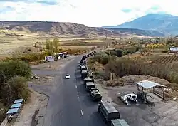 Since 12 December 2022, citizens of Azerbaijan claiming to be "eco-activists" started protests on the Lachin corridor,[86] thus effectively blocking the only road connecting Artsakh to the outside world and to Armenia[87] in violation of the trilateral ceasefire agreement of 9 November 2020. Although the Azerbaijanis claim to have peaceful intentions, their blockade is causing severe consequences for the population; importation of food, fuel, and medicine is blocked, and the 120,000 residents of the region are trapped, creating a humanitarian crisis.[88] Despite statements from the Russian side, assuring of Russian peacekeepers' efforts to reinstate free movement on the corridor[89][90] the road has remained blocked, which has drawn international criticism toward the mission.[91][92]