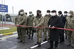 The Turkish officers arrived in Azerbaijan on 30 January 2021,[37] and the RTJMC was opened near Marzili in Aghdam on the same day according to Russian state media TASS.[38] The Azerbaijani Minister of Defence, Zakir Hasanov, the Deputy Turkish Minister of National Defence, Yunus Emre Karaosmanoğlu, the Deputy Russian Minister of Defence, Alexander Fomin, represented their countries at the opening. They first cut the red ribbon in front of the RTJMC, followed by the national anthems of Azerbaijan, Turkey, and Russia respectively. The opening ceremony ended with a tree planting event by Azerbaijani, Turkish and Russian officials.[39]
