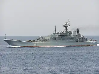The ship took part in several conflicts on behalf of the Russian Navy. In 1999 she and three other Black Sea Fleet landing ships were used for deployment of the Russian contingent on the KFOR mission in Kosovo.[8] The ship took part in the Russo-Georgian conflict in 2008.[3] In 2012 the landing craft was sent to the Russian military base at Tartus, Syria with a contingent of marines to protect the base.[9] In October 2015, Tsezar Kunikov was sent to Syria with a cargo of weapons and ammunition for the Syrian Arab Army.[10]