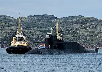 K-117 Bryansk is a Russian Project 667BDRM Delfin-class (NATO reporting name: Delta IV) nuclear-powered ballistic missile submarine. The submarine was laid down in April 1985 in the Russian Northern Machinebuilding Enterprise, Sevmash. In September 1988 the submarine was commissioned in the Soviet navy. When launched the submarine became the 1000th Russian/Soviet submarine constructed.[1] After the collapse of the Soviet Union the submarine continued to serve in the Russian navy. In July 2002 the submarine went into overhaul and didn't return until early 2008.[2] As of 2010 the submarine is on active duty with the Russian Northern Fleet.