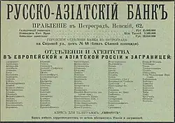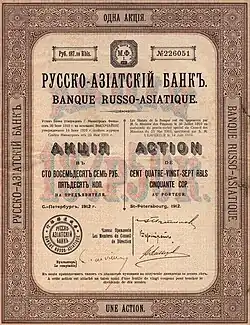 The Russo-Asiatic Bank (Russian: Русско-Азиатский банк, French: Banque russo-asiatique, Traditional Chinese: 俄亞銀行) was a major Russian bank between 1910 and 1917. It was formed in 1910 through the merger of the Russo-Chinese Bank, with activities in Russia, China and Central Asia, and the Banque du Nord ("Northern Bank", Russian: Северный банк), a large domestic Russian bank. By 1914, it was Russia's largest private-sector bank by total assets.[1]: 722  In late 1917 following the Russian Revolution, like all other commercial banks in Russia, its Russian operations were absorbed into the State Bank with no compensation to its shareholders.[2] Its activities in Europe and China lingered for a while, but were eventually liquidated in 1926.[1]: 758