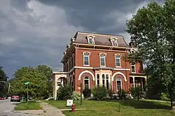 The western boundary is Court Street between Washington and West Streets. The junction of Court and Center Streets is home to the Rutland County Courthouse, an elaborate Italianate brick building constructed in 1869, after the county's first courthouse burned down. Across Court Street stands the Rutland Free Library, which was built in 1856-58 as a federal building and post office, and was the first major building constructed in the district. It is also an elaborate Italianate design, credited to Ammi B. Young. The district's northern boundary is West Street, the main westbound thoroughfare from Rutland's downtown area, between Main and Elm Streets.[2]