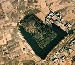 Built in the latter half of the 5th century, or the middle of the Kofun period, the Ryōgūzan Kofun has a surrounding moat and a total length of 206 meters. An archaeological excavation from 2002 to 2004 discovered a new moat around the outside of the surrounding moat, revealing that the original construction had a double moat. Including the two surrounding moats, the total length of the burial mound reaches 349 meters on the main axis. The outer moat is buried under surrounding paddy fields, but the inner moat is still filled with water (and is used as a reservoir for agriculture). The tumulus itself is about 120 meters wide at the anterior rectangular portion, 100 meter in diameter at the posterior circular portion, and about 20 meters high at both portions. No fukiishi or haniwa have been found. Since the tumulus itself has not been excavated, the details of the burial chamber are is unknown. The dimensions of the tumulus appear to be based on a two-fifths scale of the Daisenryō Kofun (tomb of Emperor Nintoku in Sakai, Osaka), and indicates that the person buried at the Ryōgūzan Kofun was an influential person with strong ties to theYamato kingdom.[2]