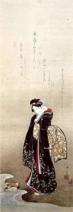 ![]() A Beauty Standing by a Stream painting on silk by Ryūryūkyo Shinsai, c. 1805 | |