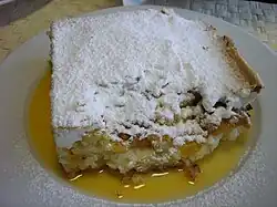 In Slovak and Czech cuisine, ryžový nákyp (Slovak pronunciation: ['riʐɔʋiː naːkip]; Czech: rýžový nákyp, Czech pronunciation: ['rɪ:ʒoviː naːkɪp], translate to “rice cake”) is a cake-like rice pudding made of rice, milk, eggs, butter, and sometimes raisins or other dried fruit.[1] It is usually served with apricot, peach, plum, cherry or other fruit compote, sprinkled with powdered sugar, or topped with beaten egg white.[1] It may be served as a second course, a main dish[2] or a dessert.[3] It may be served warm or cold.[1]