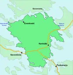 Sääminginsalo has been said to be the largest true island of Finland (area 1,069 km2 or 413 sq mi). If it is considered as an island, it is the third largest island in a lake in the world.[1] This inland island is located in Southern Savonia region, Eastern Finland and is surrounded by the lake Greater Saimaa (Haukivesi, Puruvesi and Pihlajavesi), and an artificial canal, Raikuun kanava, that was built in 1750s.[2][3] The most famous sight on Sääminginsalo is the Kerimäki Church, the largest wooden church in the world.