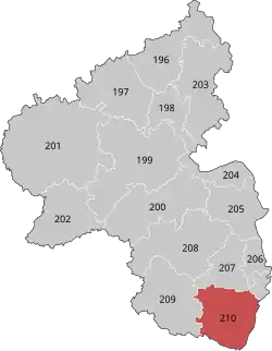 Südpfalz is an electoral constituency (German: Wahlkreis) represented in the Bundestag. It elects one member via first-past-the-post voting. Under the current constituency numbering system, it is designated as constituency 210. It is located in southern Rhineland-Palatinate, comprising the city of Landau and the districts of Germersheim and Südliche Weinstraße.[1]