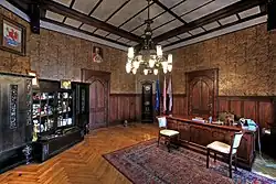 The town hall's most unique interior space is the mayor or president’s office which has twelve walls and is decorated with original furniture and an exceptional tapestry. In the second mayor's office, there is a painting by Friedrich Klein-Chevalier that depicts hunting for salmon. Some rooms feature original Art Nouveau details.[3] The conference room has a hidden door that leads to a space that fits a small man. The building also has hidden passages and tunnels.