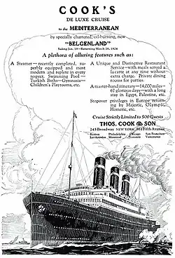 In May 1923 the British travel agency Thomas Cook & Son announced that it would charter Belgenland for a Mediterranean cruise. Despite her capacity for 2,500 passengers, Thomas Cook set a limit of 500,[24] and secured bookings for 420. Belgenland began the cruise on 19 January 1924, leaving New York for destinations including Palestine and Egypt. Passengers would have the option to see archæological sites including the Tomb of Tutankhamun,[25] whose recent discovery in November 1922 had inspired great popular interest in Egyptology.