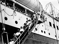 In November 1945 Katoomba was delayed in Brisbane for three weeks, as her 40 stokers refused to sail because they were two men short. On 19 November she left Brisbane for Bougainville Island to repatriate Australian troops.[24] A letter was published, allegedly written after a meeting of 3,000 AIF and RAAF personnel on Bougainville awaiting repatriation, threatening that when Katoomba reached Torokina harbour all the stokers would be thrown overboard. On 27 November the ship called at Townsville, where the stokers asked for the Army Minister Frank Forde and Air Minister Arthur Drakeford to guarantee their safety.[25][26]
