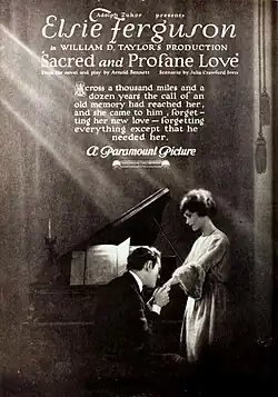 Sacred and Profane Love is a 1921 American silent drama film produced by Famous Players–Lasky and distributed by Paramount Pictures. This film was directed by William Desmond Taylor and starred Elsie Ferguson with Conrad Nagel. It is based on a book The Book of Carlotta by Arnold Bennett and was turned into a 1920 Broadway play which also starred Elsie Ferguson. Writer/director Julia Crawford Ivers adapted the book and play to the screen while her son James Van Trees served as one of the film's cinematographers. All known copies of this film are lost.[1][2][3]