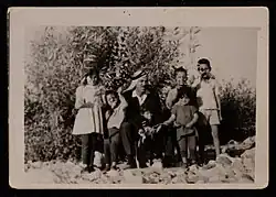 Saeed Qazaz and His Children, Jordan, 1960. Taken in 1960, this photograph shows Saeed Qazaz, maternal uncle of Fadeyyeh Darabe, wearing a Hatta and Agal with his children in Zarqa.