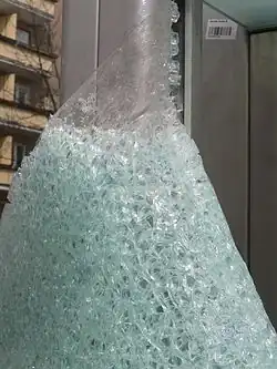 Laminated glass is composed of layers of glass and plastic held together by an interlayer.[8] When laminated glass is broken, it is held in place by an interlayer, typically of polyvinyl butyral (PVB), between its two or more layers of glass, which crumble into small pieces. The interlayer keeps the layers of glass bonded even when broken, and its toughening prevents the glass from breaking up into large sharp pieces.[9] This produces a characteristic "spider web" cracking pattern (radial and concentric cracks) when the impact is not enough to completely pierce the glass.[10]