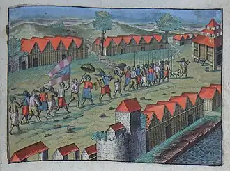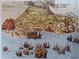 The Dutch first arrived to Indonesia in 1596 and were, like the Portuguese, bent on controlling the spice trade. Their first visit to Ternate followed in 1599 with two ships under Captain Wijbrand van Warwijk. Sultan Saidi received them in a friendly mood, hoping to use the newcomers against his indigenous and European enemies. The Dutch described him as strong, big man of about 36 years, pleasant, humorous and very curious about new things. He was a renowned warrior and a devoted Muslim. Ternate was described as almost devoid of foodstuff apart from sago. Local society was only partly monetarized. The inhabitants had a "good and sweet" temper though they bore a mortal hatred for the Portuguese. When Van Warwijk departed he left some crew members on the island in order to stock cloves.[11] A new visit under Jacob Cornelisz van Neck took place in 1601. Since Spain and Portugal were at war with the Dutch Republic in Europe, the presence of the newcomers alarmed the Iberian colonist. A Spanish-Portuguese force once again tried to conquer Ternate in 1603 but was heavily defeated by the Ternatans and Javanese mercenaries. This in turn prompted a Dutch counter-attack in 1605 under Cornelis Sebastiaansz, that captured the Iberian fort in Tidore after a furious fight. The defeated enemy was allowed to sail for the Philippines. With Saidi's consent, a Dutch token force was henceforth kept in Ternate.[12]