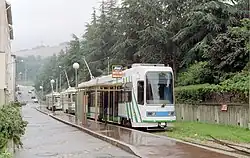 The second class of Alsthom-Vevey tramcars (20) are capable of reaching a maximum speed of 70 km/h. They were built on 23.24 m (76 ft 3 in) long H chassis and have an empty weight of 27.4 tonnes. Delivered beginning in spring 1998, 10 of the 20 cars entered service in time for the 1998 FIFA World Cup matches in June, and initially also used trolley pole current collection like the older trams, as the overhead wiring had not yet been modified for pantographs.[6][7] However, the other 10 were due to be delivered with pantographs,[6] and the earlier 10 of this series due to be converted to pantographs after mid-July 1998. The current delivered is 600 V DC.
