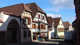 The old village consists of three parallel streets cut by side streets and alleys between half-timbered houses, forming a compact oblong area still contained within a wall. The village centre contains the church, town hall and a 19th-century school building.