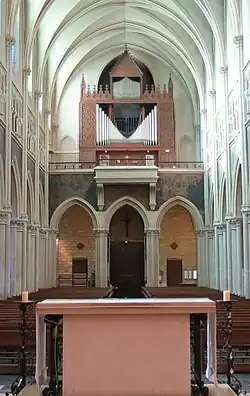 The present building dates to 1865. The facade is largely hidden by other buildings, and only the apse, over the canal, is clearly visible. It is not large (46 meters in length) and has a very sober interior, The walls are not plastered, making the stones of the wall visible.[4]