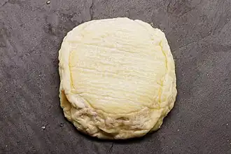 Saint-Marcellin (French pronunciation: [sɛ̃ maʁsəlɛ̃] ) is a soft French cheese made from cow's milk. Named after the small town of Saint-Marcellin (Isère), it is produced in a geographical area corresponding to part of the former Dauphiné province (now included in the Rhône-Alpes région).[1]: 162  It is generally small in size, weighing about 80 grams (50% fat), with a mottled creamy-white exterior.[1]: 162  The degree of runniness increases with age as the exterior gains blue, then yellow, hues within two to three weeks after production.[1]: 162
