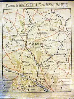The station and the bifurcation of the railroad lines, seen on an old map of the canton of Marseille-en-Beauvaisis.