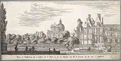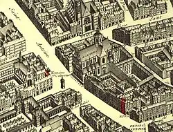Behind it was a cemetery, originally connected to the monastery of Saint-Éloi, founded by monks of saint Eloi of Noyon and Dagobert I. The old cemetery behind the church contained the remains of prominent figures, including François Rabelais, and the architect François Mansart. The monastic cemetery disappeared and the old church was demolished in 1799. The dedication to Saint Paul was carried over to the new church, though it was transferred to the more famous Paul of Tarsus, rather than Paul the Hermit.[1] A portion of the old wall still remains, next to the Lycée.